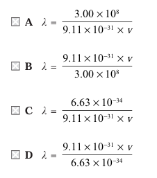 \lambda = \frac{6.63 \times 10^{-34}}{(9.11 \times 10^{-31})\, v}[/math]