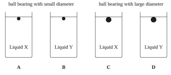 • 2. In a falling-ball method to investigate the viscosity of a liquid, ball bearings with two different diameters are allowed to fall through two different liquids, X and Y. The viscosity of liquid X is greater than the viscosity of liquid Y. In which set-up shown below will the ball bearing have the greatest terminal velocity?