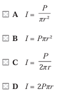 • [math]I = \frac{P}{\pi r^2}[/math]