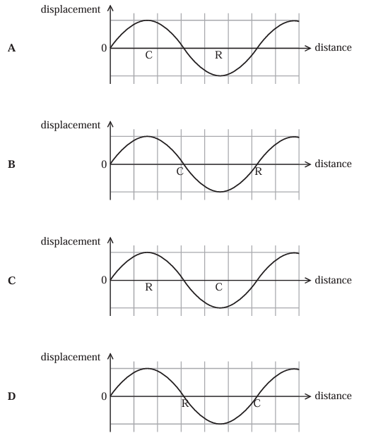 • Which graph shows the correct labelling of possible positions of a compression, C, and a rarefaction, R?